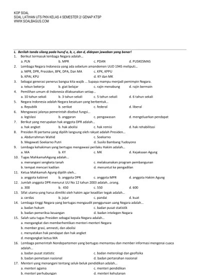Berilah tanda silang (x) pada huruf a,b,c, atau d di depan jawaban yang paling benar . Sdn samudrajaya mata pelajaran pkn kelas 5. Pada kesempatan kali ini akan kami bagikan contoh soal uts / ulangan tengah semester 2 (genap) kelas 4 /iv sd mapel pkn dan kunci jawaban . Contoh soal uts pkn kelas 4 sd / mi disertai dengan pembahasannya. Kelas mata pelajaran waktu tanggal pelaksanaan. Soal ulangan tengah semester 2. Soal uts pkn tengah semester 2 kelas 4 sd, soal tengah semester genap kelas 4 mata pelajaran pkn k13 revisi, soal dan kunci jawaban pts pkn . By sabar gandha 10 march 2020 2 comments. Daerah yang sebagian besar penduduknya memeluk agama hindu adalah. Aparat kepolisian yang terdapat di . Soal uts kelas 4 mata pelajaran pkn semester 2 tahun 2020. Soal uts/pts pkn kelas 4 semester 2 dan kunci jawaban#soaluts#kelas4.